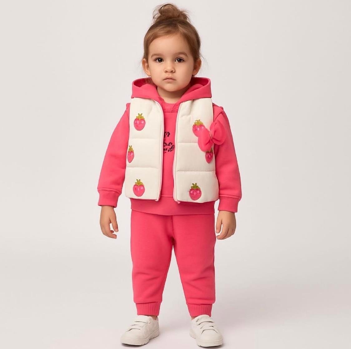 Çilek Baskılı Şişme Yelekli Üç İp Üçlü Takım-FUŞYA