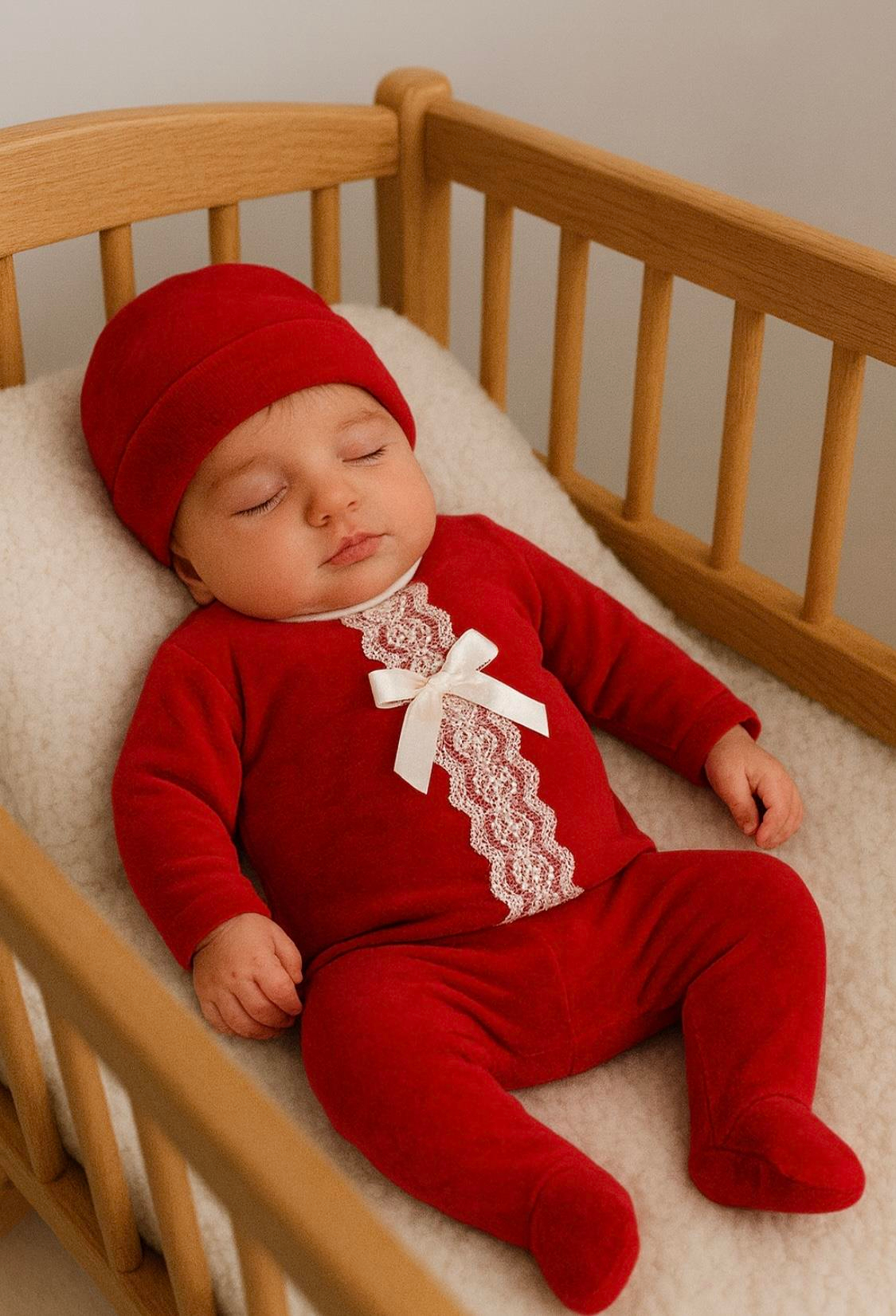 Kadife Güpürlü Üçlü Set-KIRMIZI (243412)