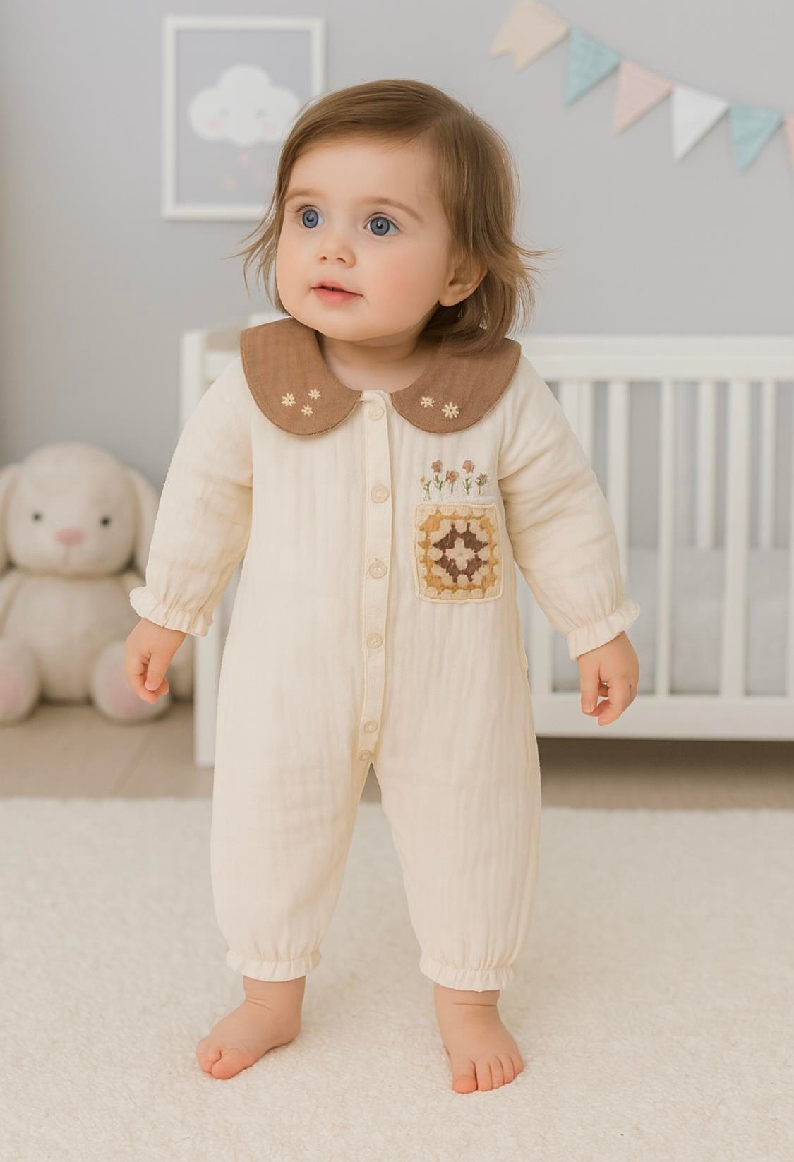 Örgü Cepli Çift Kat Müslin Kumaş Tulum-KREM