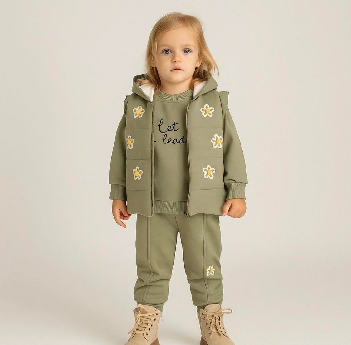 Papatyalı Baskılı Şişme Yelekli Üç İp Üçlü Takım-YEŞİL (882514)
